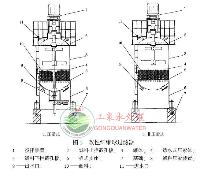 2.深床過濾原理,立式罐,采用機械攪拌方式進行反沖洗,可手動操作和自動操作;